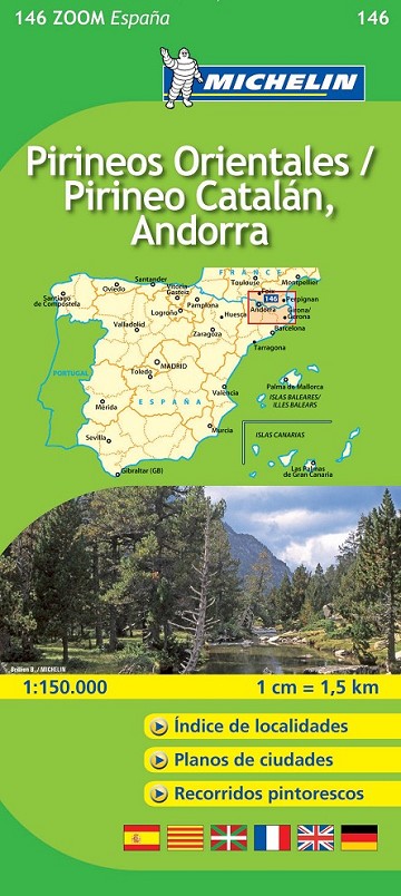 El Mapa Zoom Pirineos Orientales / Pirineo Catalán, Andorra, editado a escala 1/150 000, presenta la leyenda en seis idiomas (castellano, euskera, catalán, alemán, francés e inglés), índice de localidades y contiene los planos de Andorra la Vella, Foix, Gerona/Girona y Perpignan.