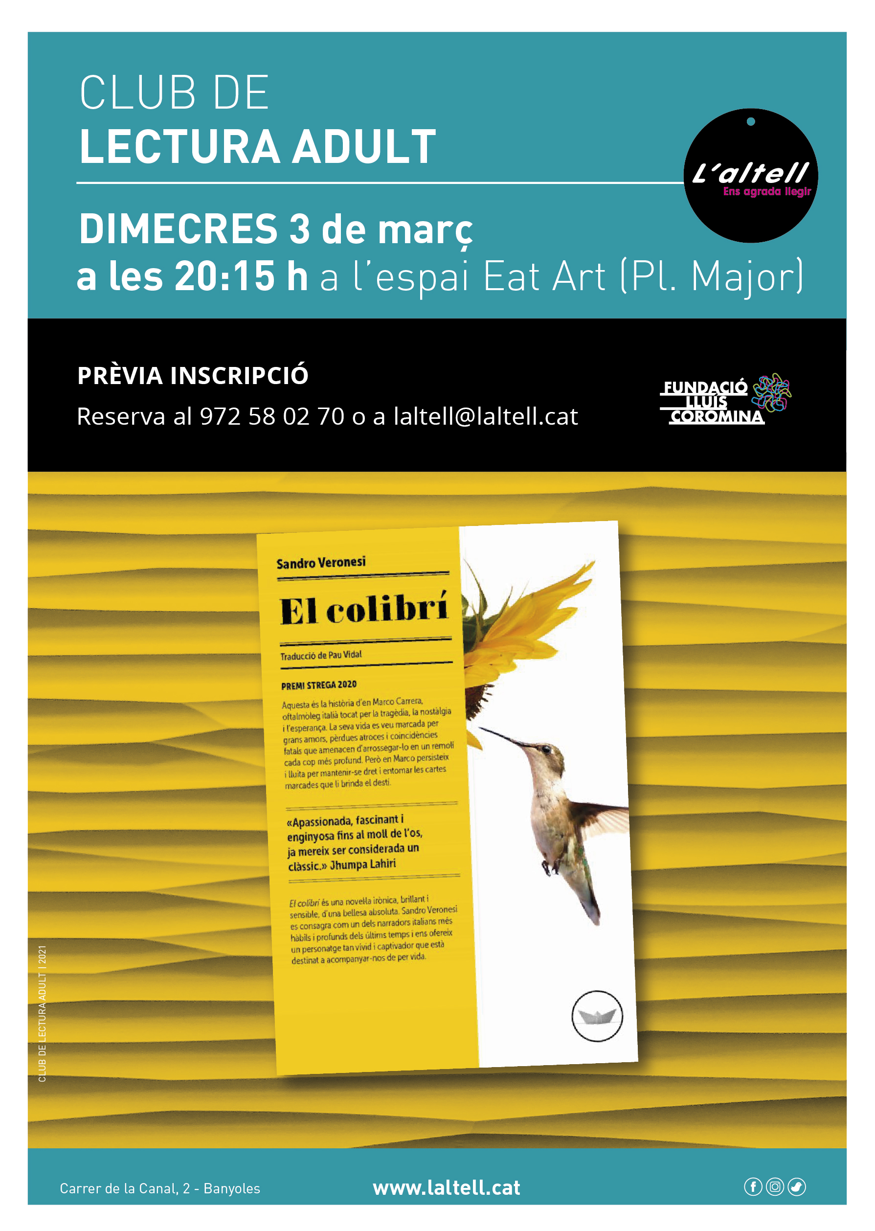 Comentarem Colibrí a l'Espai Eat Art de la Plaça Major (Fundació Lluís Coromina) el dia 3 de març a les 20:15h