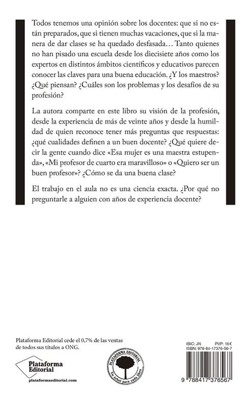 Todos tenemos una opinión sobre los docentes: que si no están preparados, que si tienen muchas vacaciones, que si la manera de dar clases se ha quedado desfasada… Tanto quienes no han pisado una escuela desde los diecisiete años como los expertos en distintos ámbitos científicos y educativos parecen conocer las claves para una buena educación. ¿Y los maestros? ¿Qué piensan? ¿Cuáles son los problemas y los desafíos de su profesión? La autora comparte en este libro su visión de la profesión, desde la experiencia de más de veinte años y desde la humildad de quien reconoce tener más preguntas que respuestas: ¿qué cualidades definen a un buen docente? ¿Qué quiere decir la gente cuando dice «Esa mujer es una maestra estupenda», «Mi profesor de cuarto era maravilloso» o «Quiero ser un buen profesor»? ¿Cómo se da una buena clase? El trabajo en el aula no es una ciencia exacta. ¿Por qué no preguntarle a alguien con años de experiencia docente?