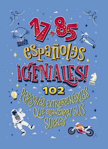 Este libro cuenta las extraordinarias vidas de 102 españoles geniales que han hecho y siguen haciendo historia en 102 relatos asombrosos con ilustraciones muy molonas. Un libro motivador y entretenido para que los más pequeños descubran a los grandes personajes españoles en el que, además, verán que es posible hacer realidad los sueños a través de las singulares vidas de 51 mujeres y 51 hombres extraordinarios. Científicos, emprendedores, deportistas, escritores, músicos,... desde el tenista Rafa Nadal, la reina Isabel la Católica, el inventor Leonardo Torres Quevedo hasta la cantante Rosalía, el navegante Juan Sebastián Elcano o la científica Margarita Salas, son algunos de los grandes protagonistas de 17+85 españoles geniales.