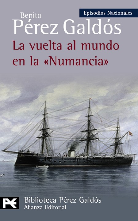 El gran friso narrativo de los Episodios Nacionales sirvió de vehículo a Benito Pérez Galdós (1843-1920) para recrear en él, novelescamente engarzada, la totalidad de la compleja vida de los españoles -guerras, política, vida cotidiana, reacciones populares- a lo largo del agitado siglo xix. Completada desde febrero de 1865 a septiembre de 1867, LA VUELTA AL MUNDO EN LA «NUMANCIA» fue un hecho glorioso que renovó en el siglo xix las viejas proezas de los antiguos navegantes españoles. Considerada en su momento la joya de la Armada, esta fragata blindada fue destinada de inmediato a la «Guerra del Pacífico», en la que participó destacadamente. Dañada y desprovista de carbón, acabó circunnavegando el globo desde allí. Galdós describe en este episodio la vida marinera, así como tipos y costumbres peruanos.