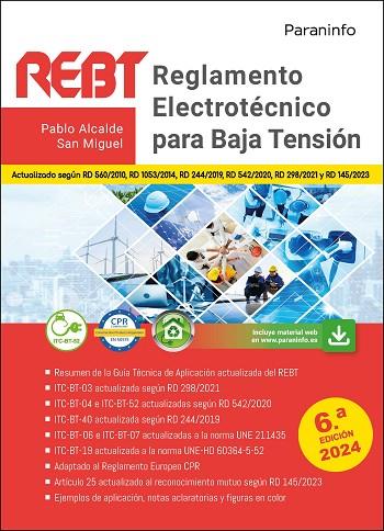 Esta nueva edición del REBT que aquí presentamos está totalmente corregida y actualizada según: -- RD 298/2021, por el que se amplía el campo de aplicación del REBT que afectará ahora también a cualquier modificación o reparación de las instalaciones; además, se añaden cambios relativos a la competencia de las empresas instaladoras, y a los requisitos para la acreditación del Instalador en Baja Tensión, así como a los conocimientos mínimos para su desempeño. -- RD 542/2020, por el que se renuevan las especificaciones particulares de las empresas distribuidoras; se dan nuevas directrices sobre la documentación y puesta en servicio de las instalaciones; y se especifican los nuevos criterios para la preinstalación en edificios de puntos de recarga para el vehículo eléctrico. -- RD 244/2019, en el que se modifica la ITC-BT-40 en relación al autoconsumo de energía eléctrica. -- RD 1053/2014, que añade la ITC-BT-52 en relación a la recarga del vehículo eléctrico. -- Reglamento Europeo CPR (posible reacción al fuego de los cables eléctricos). -- Artículo 25 actualizado al reconocimiento mutuo según RD 145/2023. Actualización de normas UNE -- ITC-BT-06 e ITC-BT-07, actualizadas a las nuevas tablas para el cálculo de la sección de conductores en líneas eléctricas aéreas y subterráneas según norma UNE 20435 (que anula y sustituye a la antigua UNE 211435). -- ITC-BT-19 actualizada a la norma UNE-HD 60364-5-52 en relación a las intensidades máximas admisibles sobre conductores en instalaciones de interior. Resumen de la Guía Técnica de Aplicación del REBT En las instrucciones técnicas complementarias de este texto se han añadido notas aclaratorias extraídas de la Guía Técnica, que serán de gran ayuda para interpretar los aspectos más complejos de este REBT. Notas, ejemplos de cálculo, figuras en color y resúmenes Con el fin de aclarar algunos conceptos que aparecen en el REBT y ayudar a su comprensión, se han incluido ejemplos de cálculo, notas con explicaciones sencillas, resúmenes y figuras en color. Material web Además se ofrecen al lector multitud de recursos didácticos como Material web, que le serán de valiosa ayuda para comprender los conceptos relativos al REBT y profundizar en ellos. Aquí se podrán encontrar, todos los Reales Decretos que afectan al REBT, la Guía Técnica completa y actualizada, diferentes normativas y multitud de documentos técnicos de utilidad. El usuario podrá acceder a este Material web mediante un sencillo registro desde la sección de «Recursos previo registro» en la página web de la obra (disponible en www.paraninfo.es).